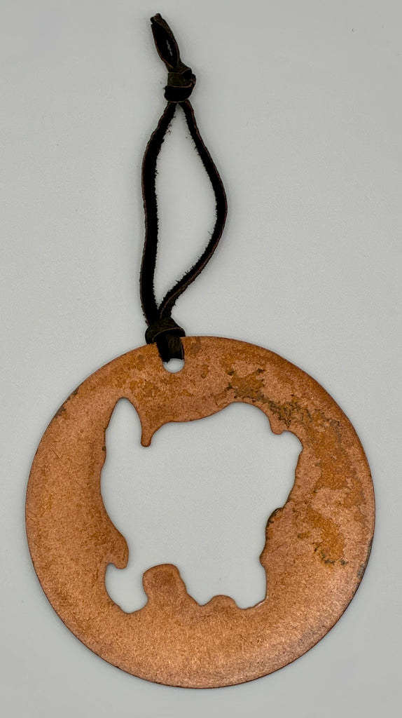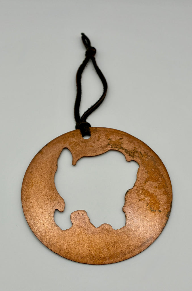 Beautiful round copper ornament with leather strand and cut out of the shape of Washington Island.