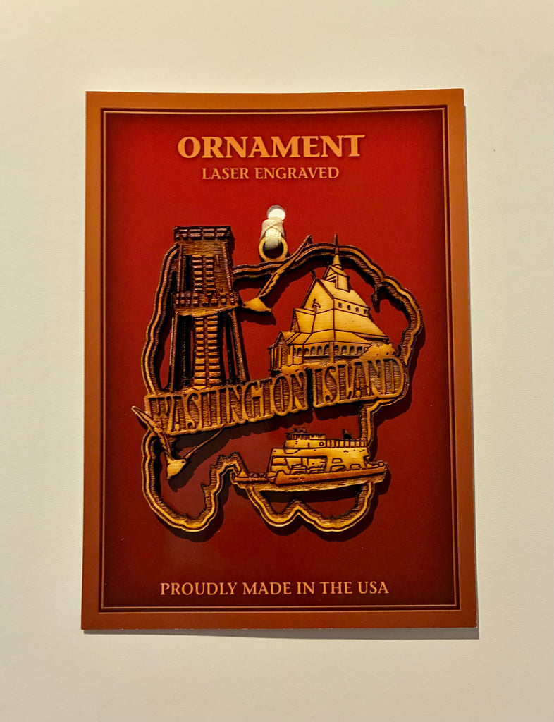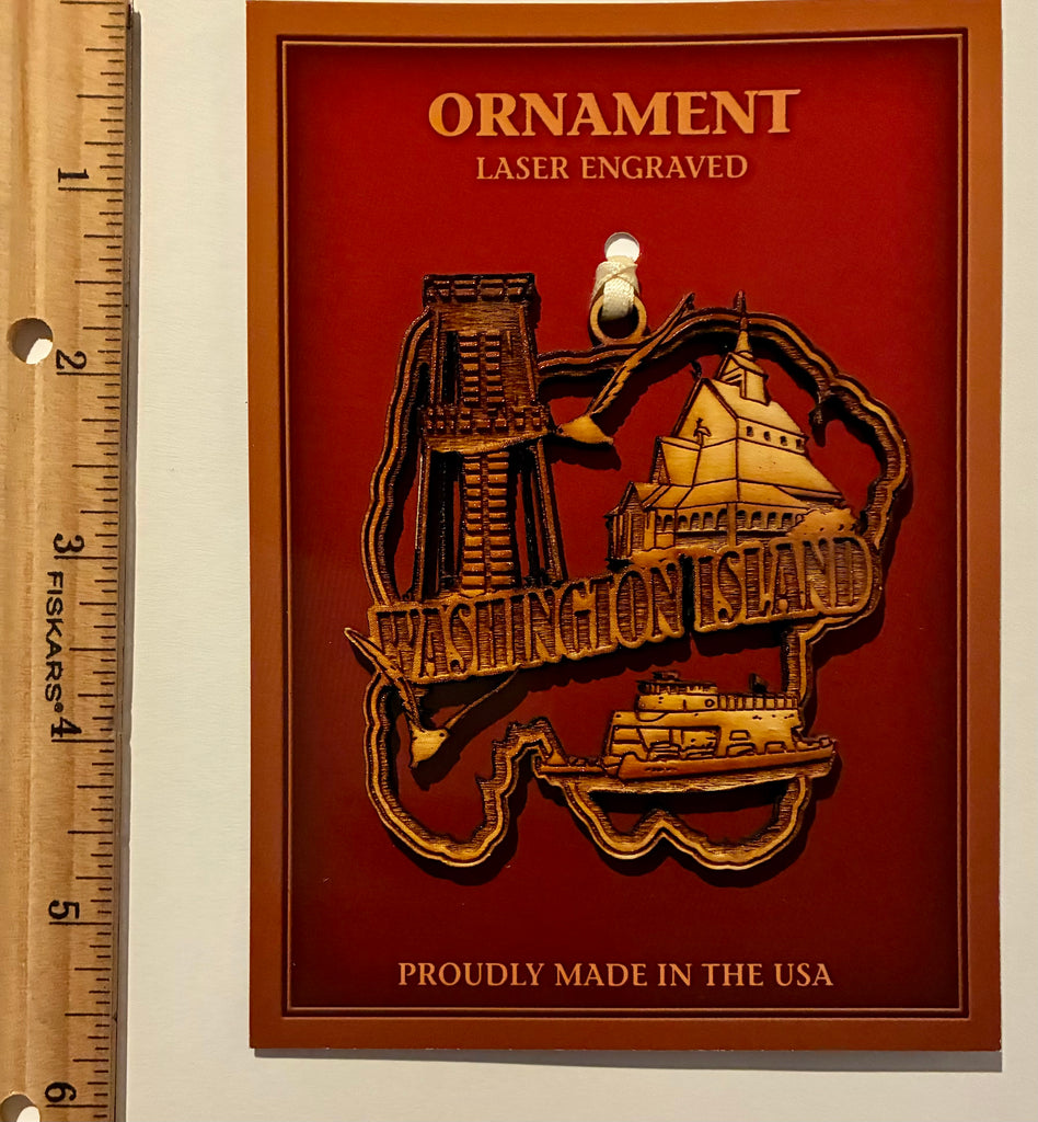 Laser engraved wood ornament.